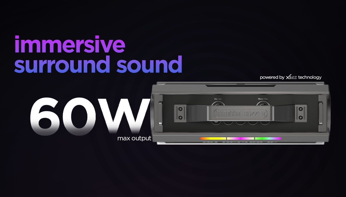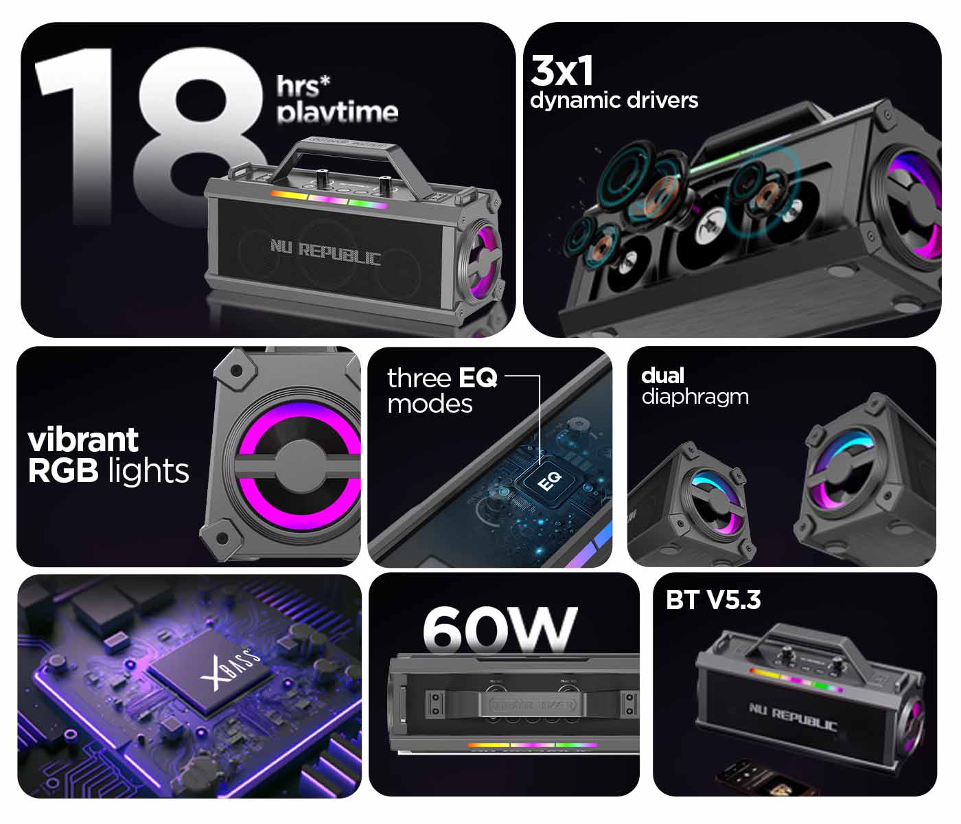 High Power Output 60W | BT V5.3 | X-Bass® technology| Auto Pair Technology | 57mm+ 78mm+57mm external magnetic horn Dynamic Driver, vibrant RGB lights