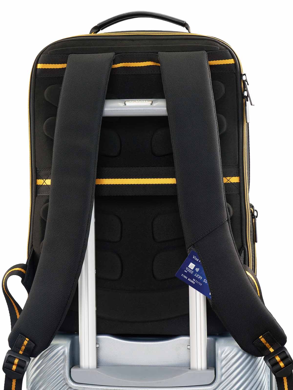 This backpack includes a built-in luggage trolley strap that slides securely over suitcase handles, making airport and city travel effortless. The padded back and sturdy straps add comfort and stability, ensuring smooth movement wherever you go.