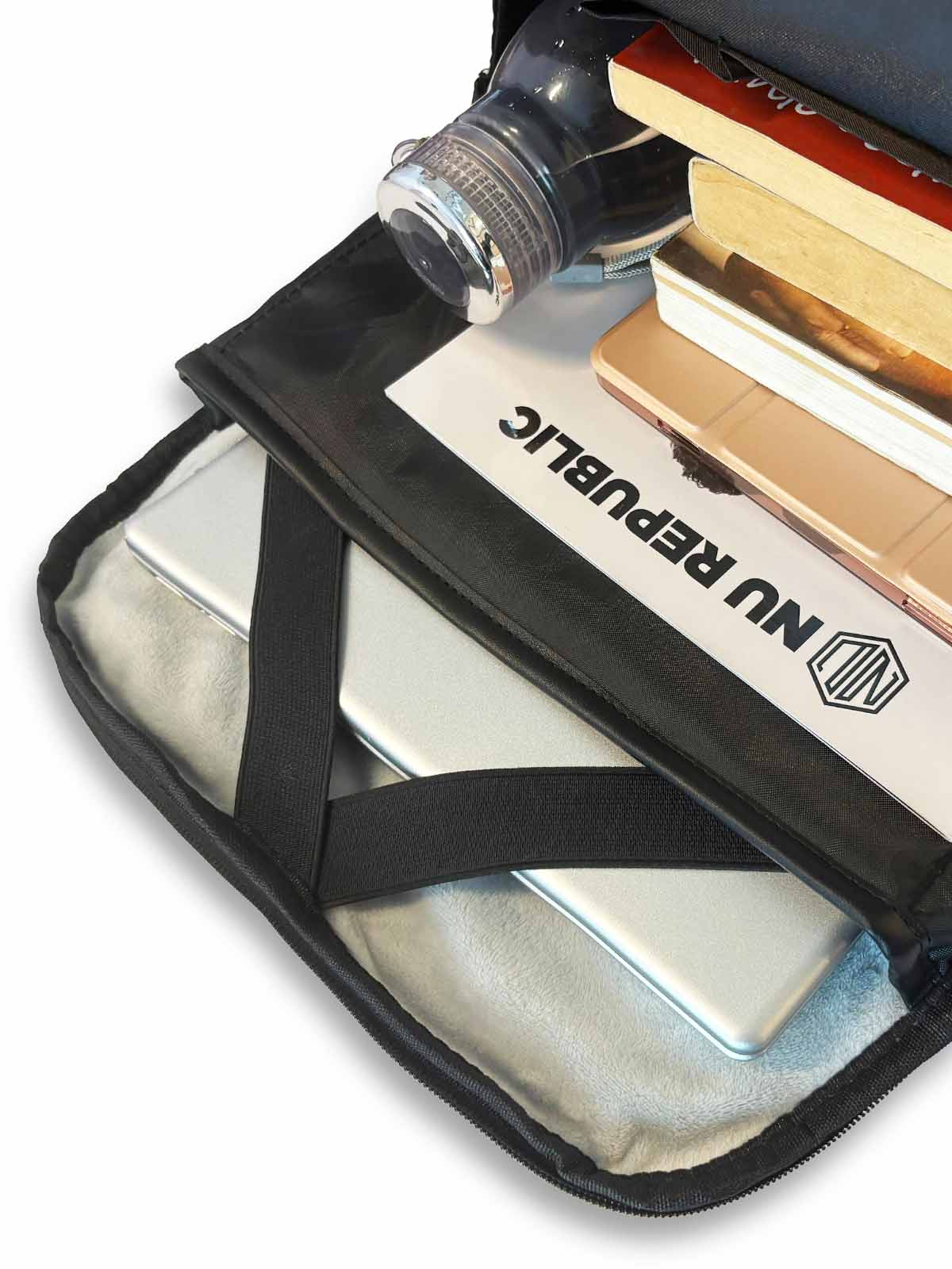 This backpack features a soft, cushioned laptop compartment with elastic cross-straps to keep your device safe and steady. The main section neatly holds books, notebooks, bottles, and essentials, ensuring everything stays organized and easily accessible on the go.