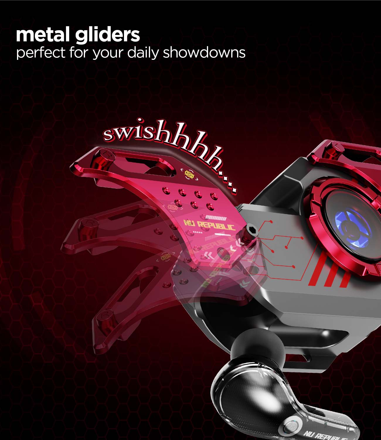 360° fidget spinner | 70hrs* playtime | ENC mode | X-Bass® technology | Touch Controls | 40ms low latency | Dual Mode (Game/Music) | metal gliders with swoosh sound | Splash and Sweat Resistance