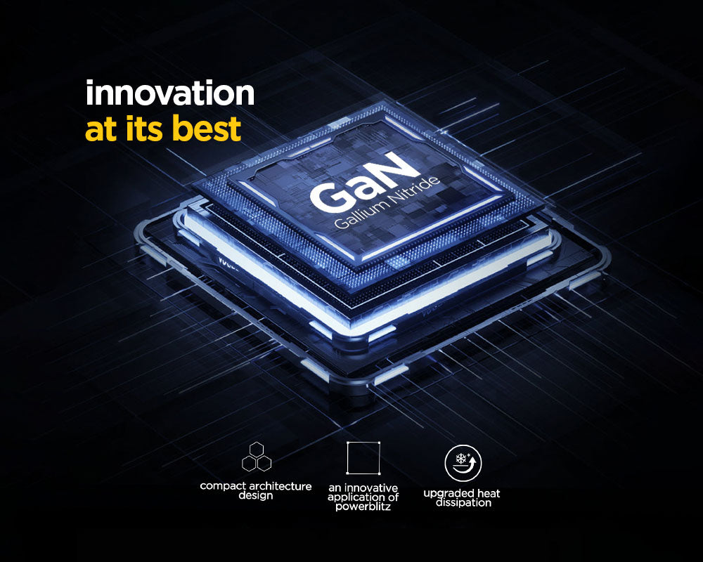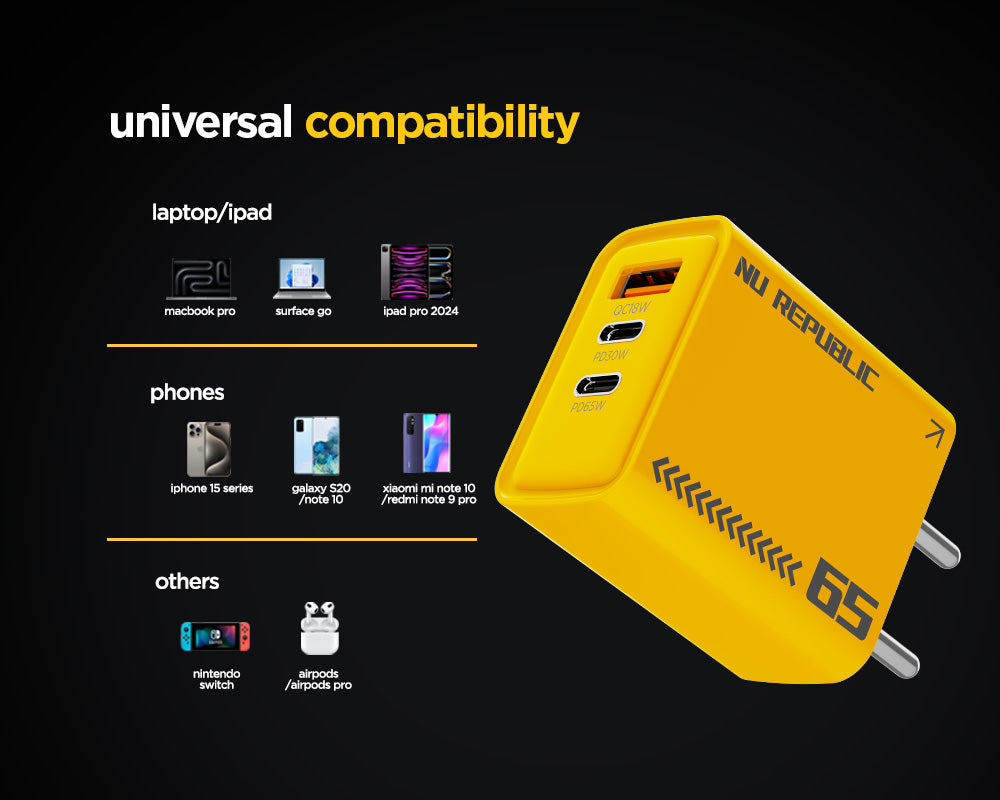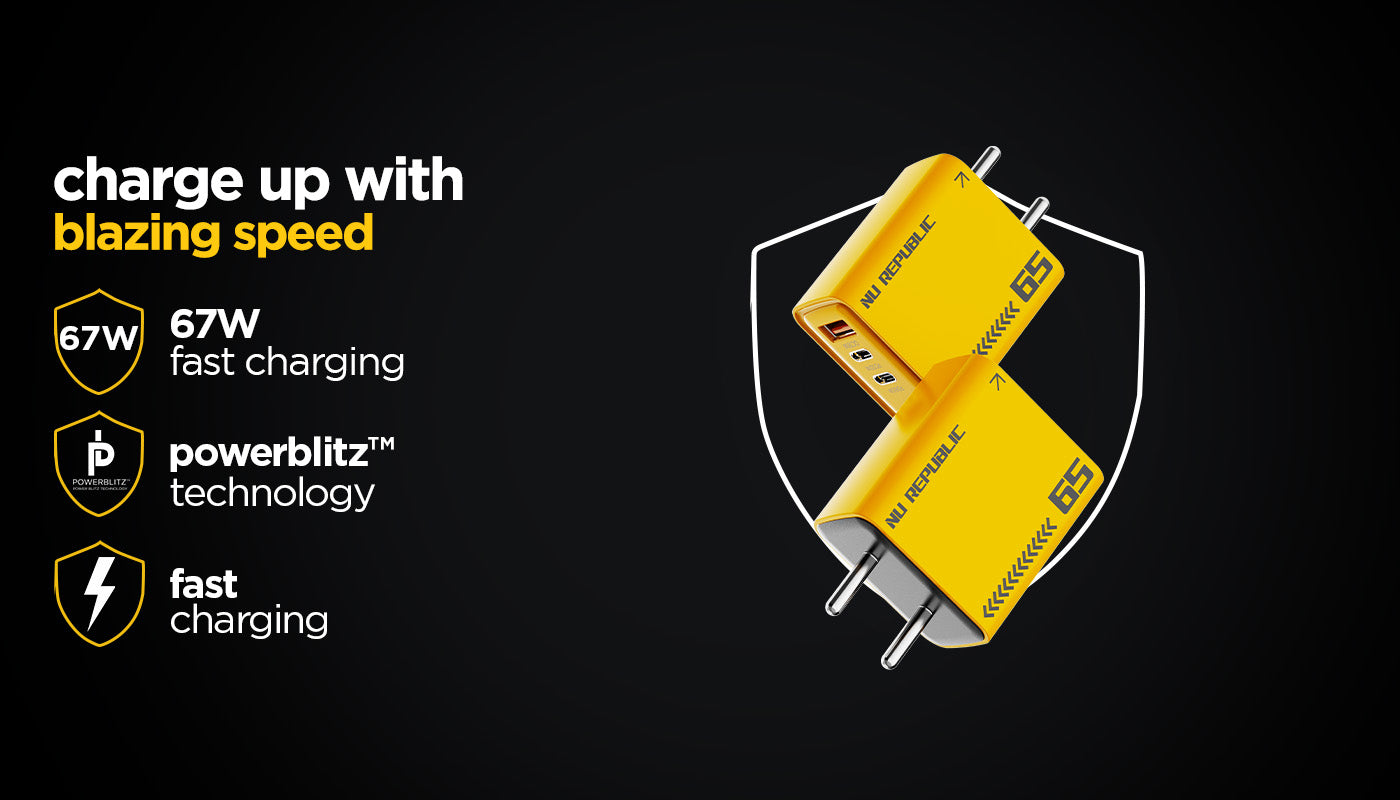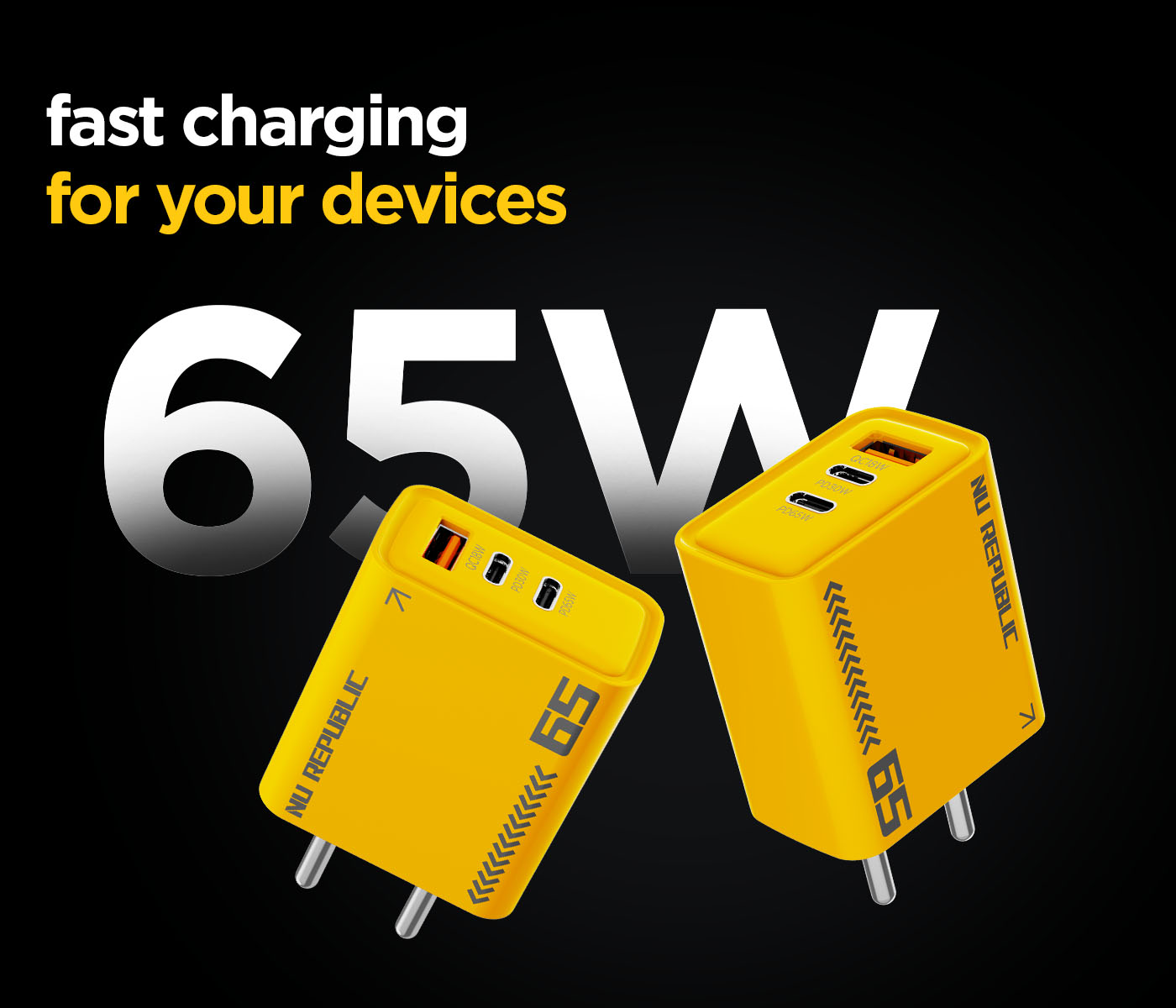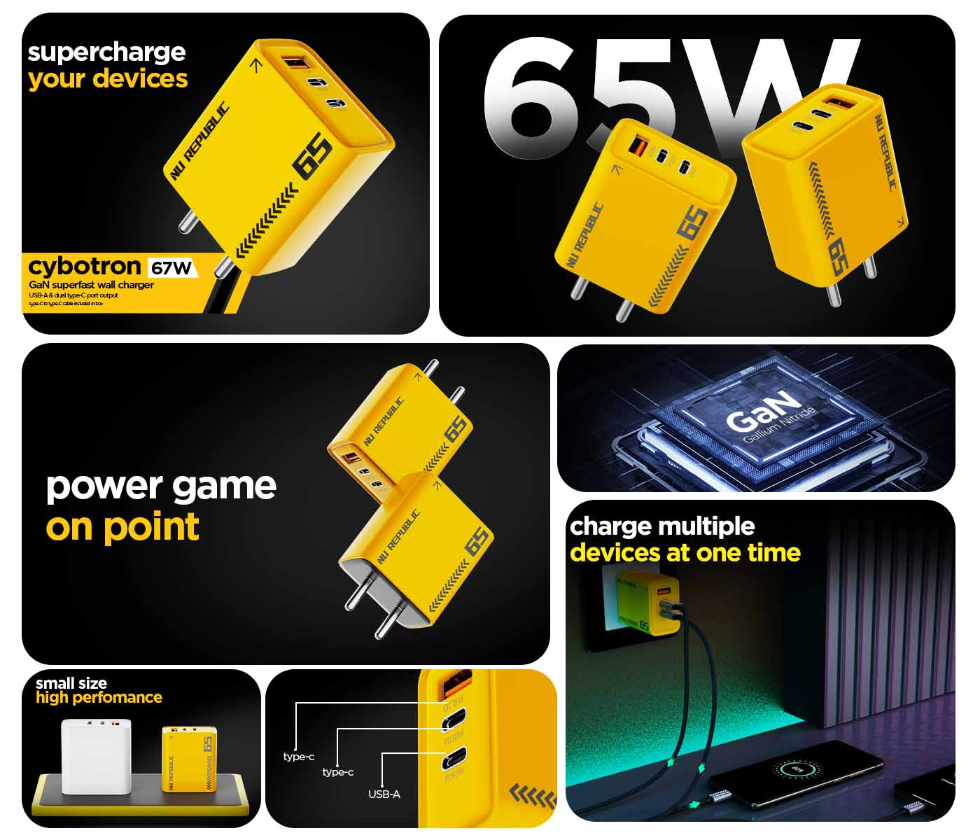 supercharge your device with Nu Republic's cybotron 65W charger. featuringsuper-fast 65W charging, built-in thermal power management and Nu Republic'sproprietary Powerblitz™ technology, cybotron 65W takes care of all your charging needs.