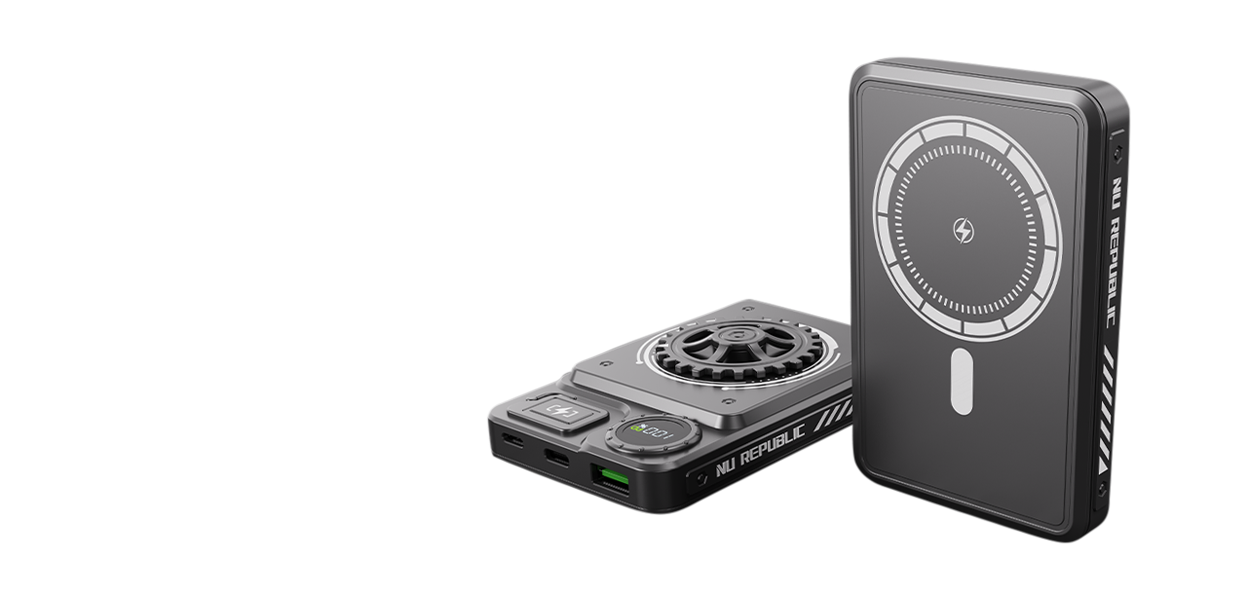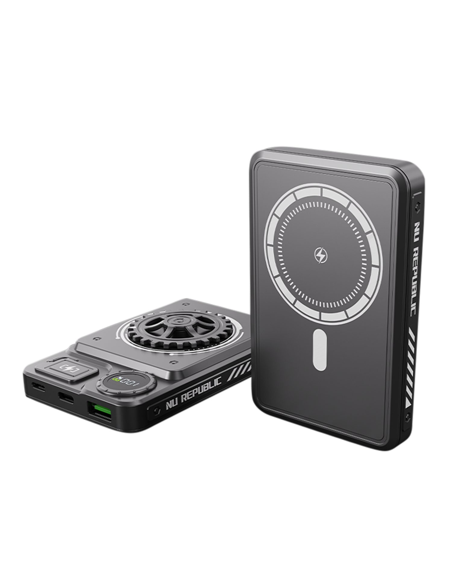 Supercharge your devices with Nu Republic's Cybotron SPIN power bank, boasting a 10,000 mAh battery, magnetic wireless charging, and Powerblitz™ technology for super-fast, precise charging.