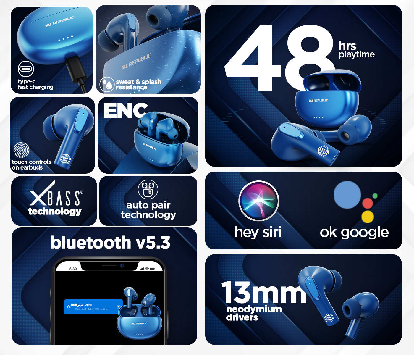 Epic X3 true wireless earphones feature 13mm neodymium drivers and powerful dual mics with built-in ENC.