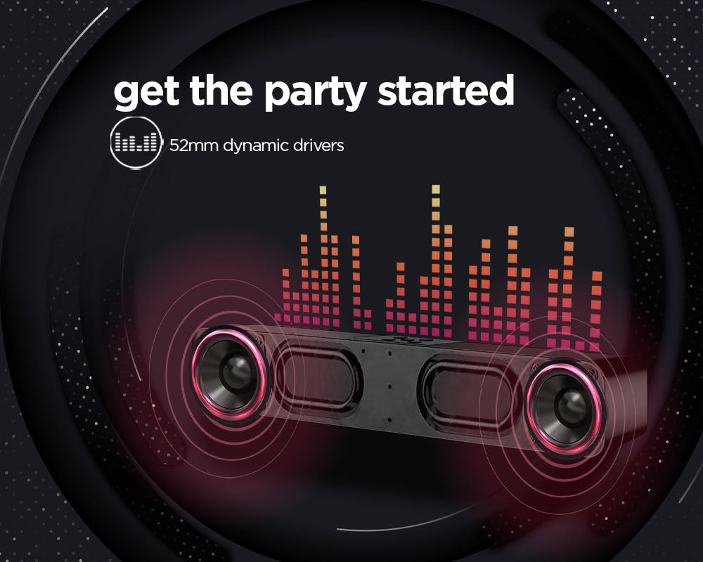 With 10 hours of music playtime and powerful 52 mm dynamic drivers in a classic slim design, Sound Bar 20 is designed to power through your parties!