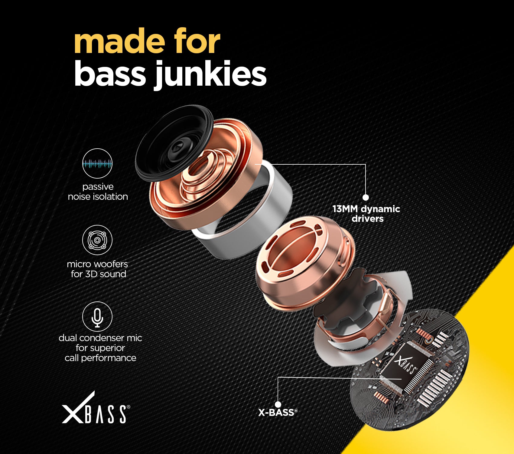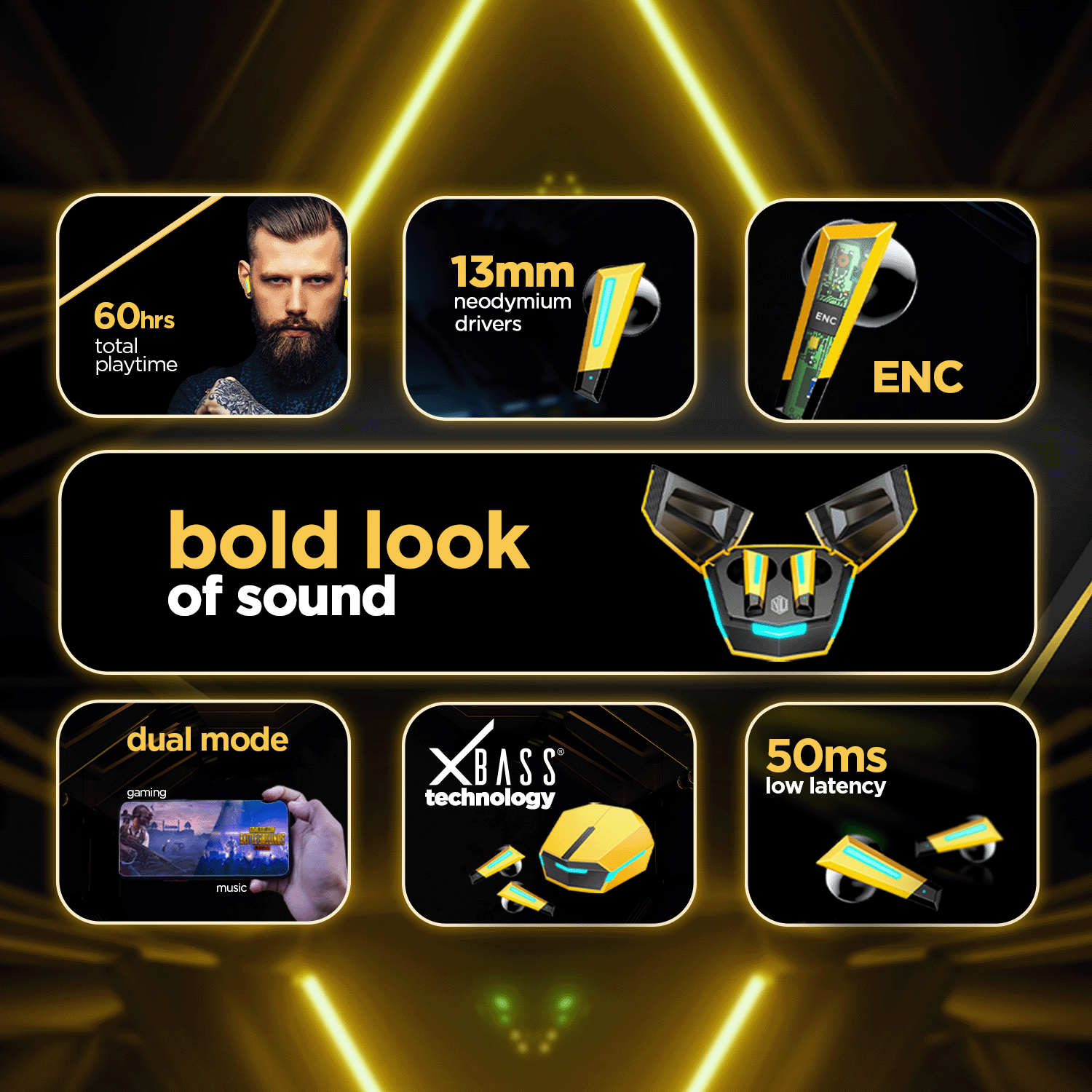 The sexy design coupled with mesmerizing LED lights on the case makes Transform-X a guaranteed head turner. Powered by X-Bass® technology, long battery life and ear vibrating sound optimized for gaming makes it the perfect TWS