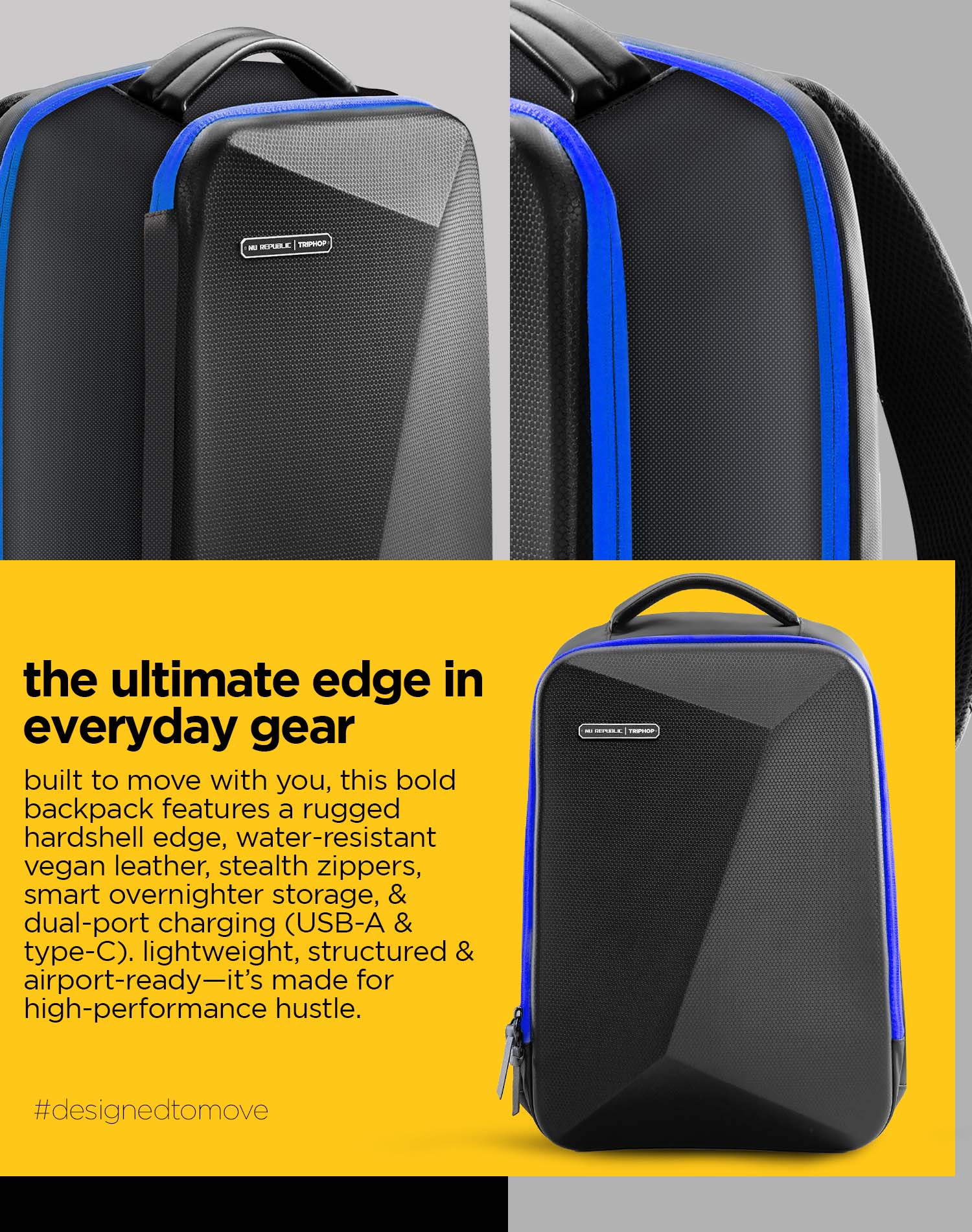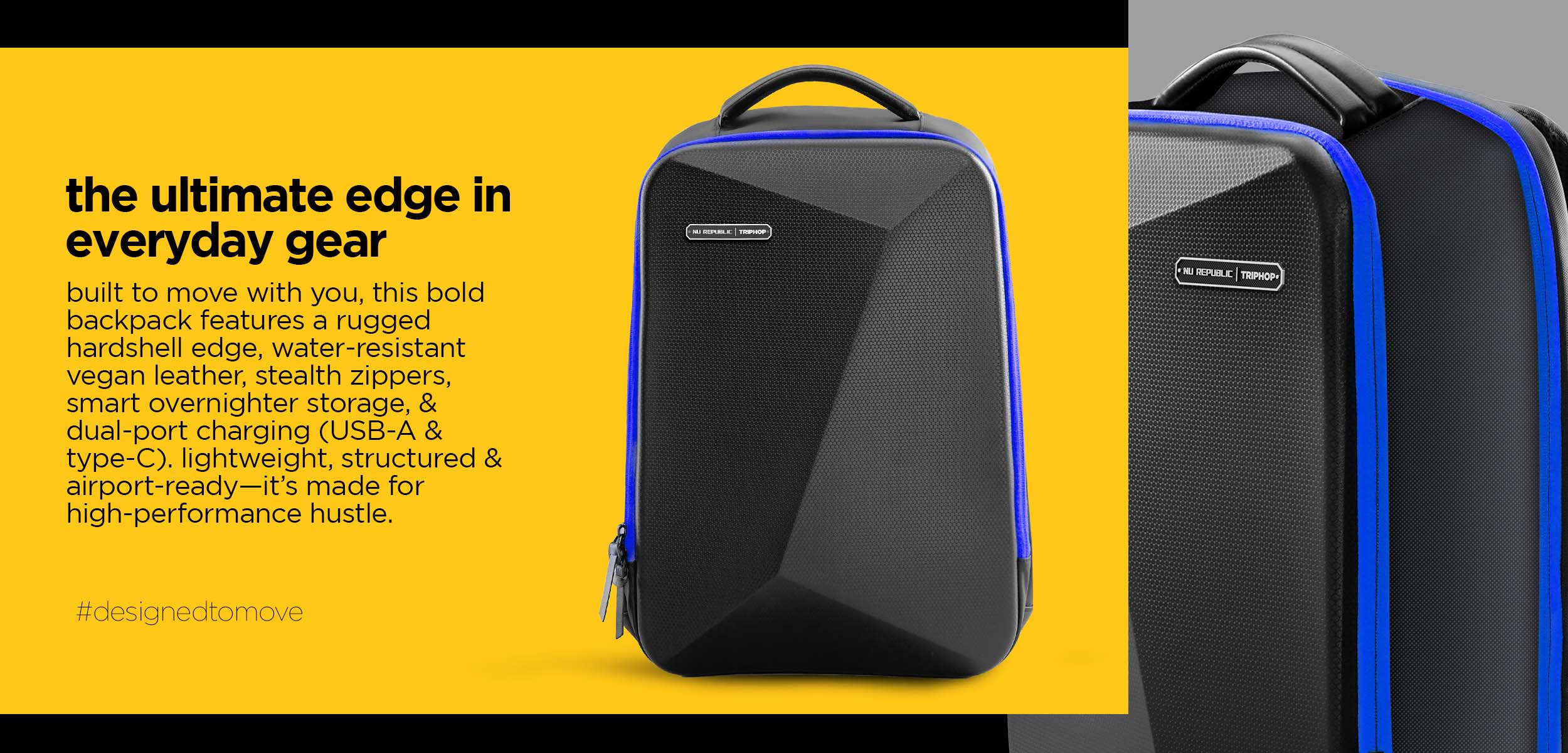 Crafted from water-resistant vegan leather and ballistic nylon, this hard-shell backpack packs a velvet-lined laptop sleeve, 4 smart compartments (with overnighter space), full-open back access, and built-in USB-A & Type-C ports. Finished with a trolley sleeve for travel — it’s style and utility on the move.